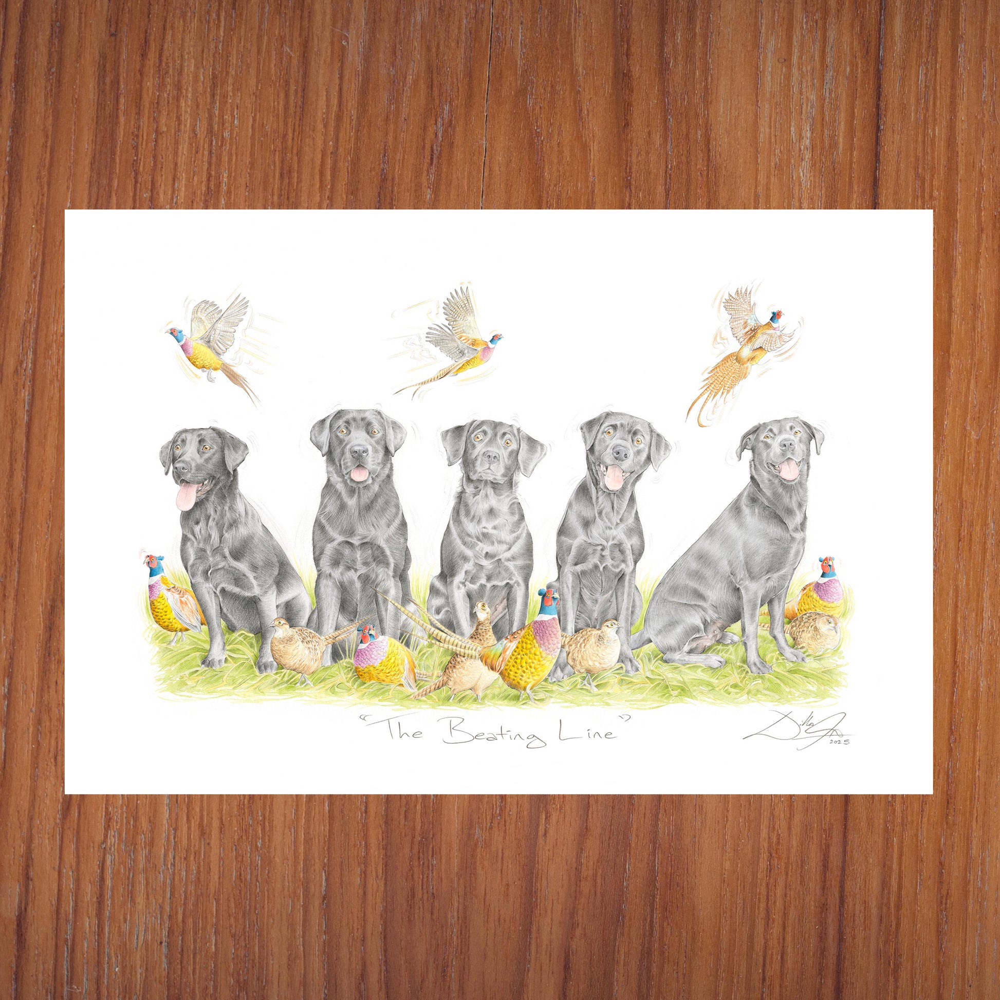 "In 2018, I was commissioned to create an illustration featuring a family's five Black Labradors of past & present. Three of the dogs had passed away, so I photographed the two that they still had and then using old photographs, had them all sitting in line and waiting for action. The original artwork was completed in ink & watercolour".